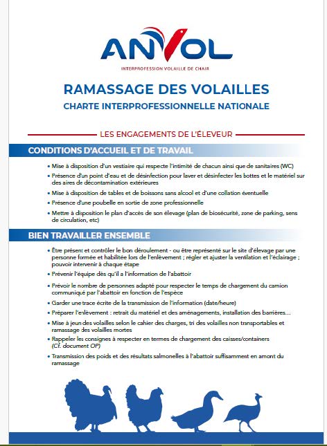 The catching phase is a high-stress moment for broilers, with risks of injury and welfare deterioration if not properly managed. The Anvol charter, developed in collaboration with a consortium of industry stakeholders, offers a set of practical, general guidelines to help farmers welcome and supervise the catching team under the best conditions. It includes reminders of key biosecurity measure, encouragement to provide basic hospitality (such as coffee, tea, or snacks), and highlights the importance of farmer presence and oversight during the process. Designed as a simple written document, and also available as a poster, the charter helps foster a respectful working environment that promotes better handling practices and supports animal welfare at a critical time.