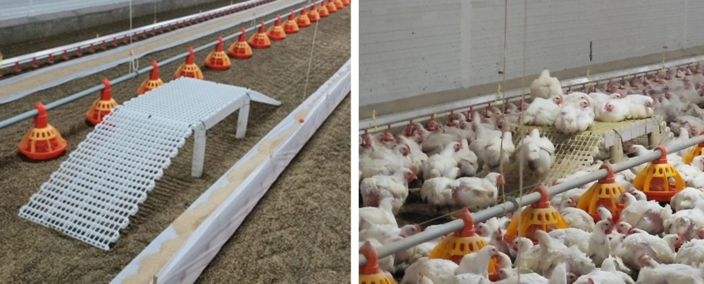 The enrichment material offered by this good practice consists of elevated platforms with easy access, such as ramps, for the broiler chicken at all stages of their growth at the poultry farms. These platforms are aimed at mitigating the occurrence of leg injuries resulting from rapid growth due to genetic selection and support species-specific behaviour, for instance, perching and resting. Modern fast-growing broilers spend excessive periods resting and their activity further decreases with age. Inactivity has been suggested to affect walking ability and the incidence of leg disorders negatively. Elevated platforms bring additional possibilities for locomotion to broilers and seem to improve their leg health. The platforms are incorporated into the barns before the arrival of the chicks, and it has been immediately observed that they climb onto them. The platforms are made of plastic material by the farmer using old slats from hen farms. Their size is approximately 3 x 0.70 m, and the ratio is 0.3m2/1000 chickens. No improvement has been quantified or observed regarding productive rates or the level of injuries.