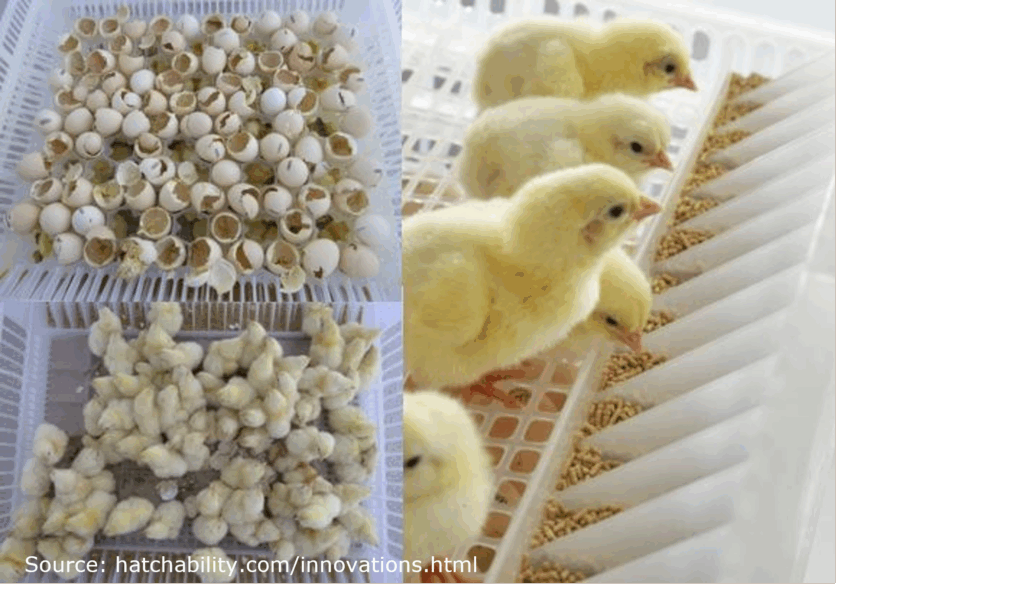 In a commercial hatchery, broiler chicks hatch within a period of 24-48 hours in an incubator. Only once the hatching phase is over, all of the hatched animals are removed from the incubator and transported to the barns for rearing within a maximum period of 72 hours. All this time, no water or feed is available until they arrive in the poultry house. This delayed feeding can have detrimental effects on the chicks’ early development in terms of their digestive tract, organs, immune and thermoregulatory systems. Therefore, the “Hatch-Care” system was developed, where newly-hatched chicks are immediately supplied with the basic necessities of life – feed, fresh water and light. This prevents dehydration and stimulates their growth and development. Hatched chicks enter through open spaces in the HatchCare tray a clean, spacious post-hatch basket free of unhatched eggs and empty shells. The basket hence provides chicks with about 40% more space than traditional systems. In the HatchCare basket, there are feed troughs on two sides, which contain enough feed for 24-36 hours. Drinking nipples in the HatchCare basket provide a continuous supply of fresh flowing water. Broiler producers can select a hatchery with HatchCare system for chick supply and benefit from stronger higher-welfare chicks for an optimal start. Animals with early feeding have a better weight development, lower mortality rate, and need less or no medication at the start. The farmer estimated a 5% return on sales as benefit due to a higher end weight. Rearing costs on the farm are estimated at €0.20 per animal per round. Additional costs for the hatchery are estimated at €0,02 per animal.