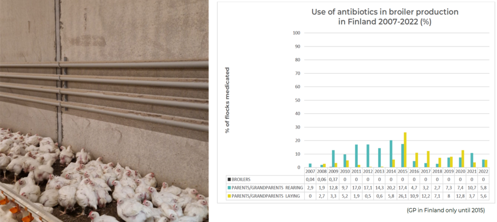 In Finland, water circulation central heating has been the most common form of heating for long time. Compared to gas heating, with water circulation central heating the air humidity is lower and bedding stays dryer throughout rearing period. Water circulation central heating also helps to control the humidity inside the rearing house even in warmer seasons. Good rearing conditions support the bird´s well-being and health, which improves cost-effectiveness and reduces the need for medication. With low disease pressure, there is less need for antibiotic treatment. Low disease pressure supports better growth and quality. Mortality is lower. The feed efficiency is better, and broilers have healthy foot pads. In 2022 in Finland, the weighted average foot pad score was 2.64/200 points. In the Finnish rearing method, stocking density and foot pad scores do not correlate with each other, as our broiler production farms have sufficient heating capacity and effective control of conditions. Central heating and its installation costs approx. 150.000 € (4.000 m2). The costs do not include the heating center. The technology exists and is available. The practice plays a significant role in Finland´s good production results. There is plenty of experience and results in practice. All kind of energy can be used for heating the circulated water. In Finland we use most often woodchips and more often combined with solar energy.